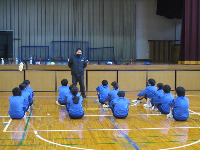 体育座りで、授業者をしっかり見て、今日やることの説明を聞く。