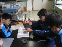 生物委員会は、カメや魚の世話をしています。2年前の4月に、1年生が理科の野外観察の際に、校庭で拾ってきた2匹の子ガメはすっかり大きくなりました。エサをあげると、カメらしからぬスピードでかぶりつく。